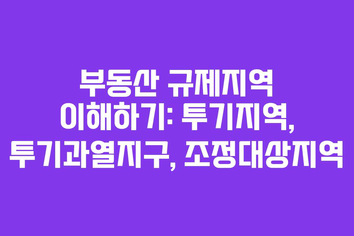 부동산 규제지역은 크게 투기지역, 투기과열지구, 조정대상지역으로 나눌 수 있습니다. 이러한 규제지역은 주택 시장의 안정화를 위해 정부에서 지정하며, 정책 변경에 따라 추가되거나 해제되는 경우가 많습니다. 따라서, 관련 정보를 지속적으로 확인해야 합니다.