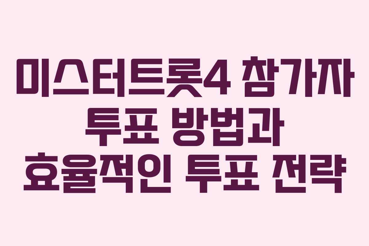 미스터트롯4의 투표는 주로 온라인 플랫폼을 통해 이루어집니다. 공식 홈페이지나 모바일 애플리케이션을 통해 간편하게 투표할 수 있습니다. 회원가입 후, 원하는 참가자를 선택하고 투표를 진행하면 됩니다.