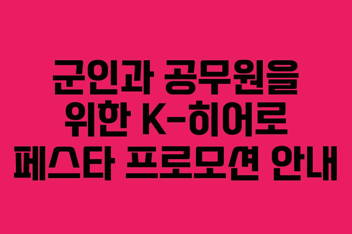 K-히어로 페스타는 대한민국의 군인, 소방관, 교정 공무원에게 특별한 혜택을 제공하는 행사로, 삼성전자가 주최하고 있습니다. 이 행사는 11월 30일까지 진행되며, 다양한 제품을 할인된 가격에 구매할 수 있는 기회를 제공합니다. 특히, 이 프로모션은 군인과 공무원의 노고를 인정하고 그들에게 감사의 마음을 전하기 위해 마련되었습니다.