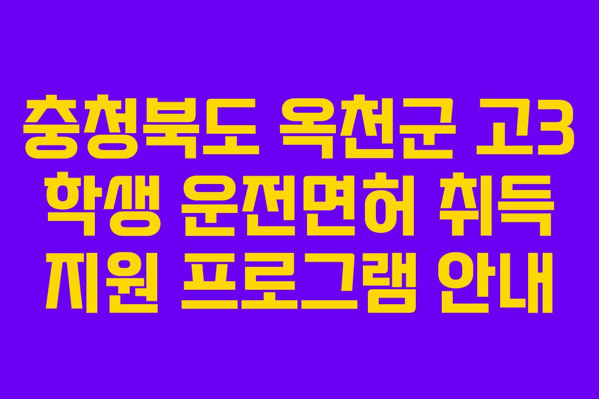 충청북도 옥천군은 관내 고등학교 3학년 학생들을 위해 운전면허 취득 지원 프로그램을 운영하고 있다. 이 프로그램은 학생들의 취업 역량 강화를 위해 마련된 것으로, 2023년 연중 진행된다. 본 프로그램은 해당 학생들에게 운전면허 취득비를 지원하여 보다 나은 미래를 위한 발판을 제공하고자 한다.