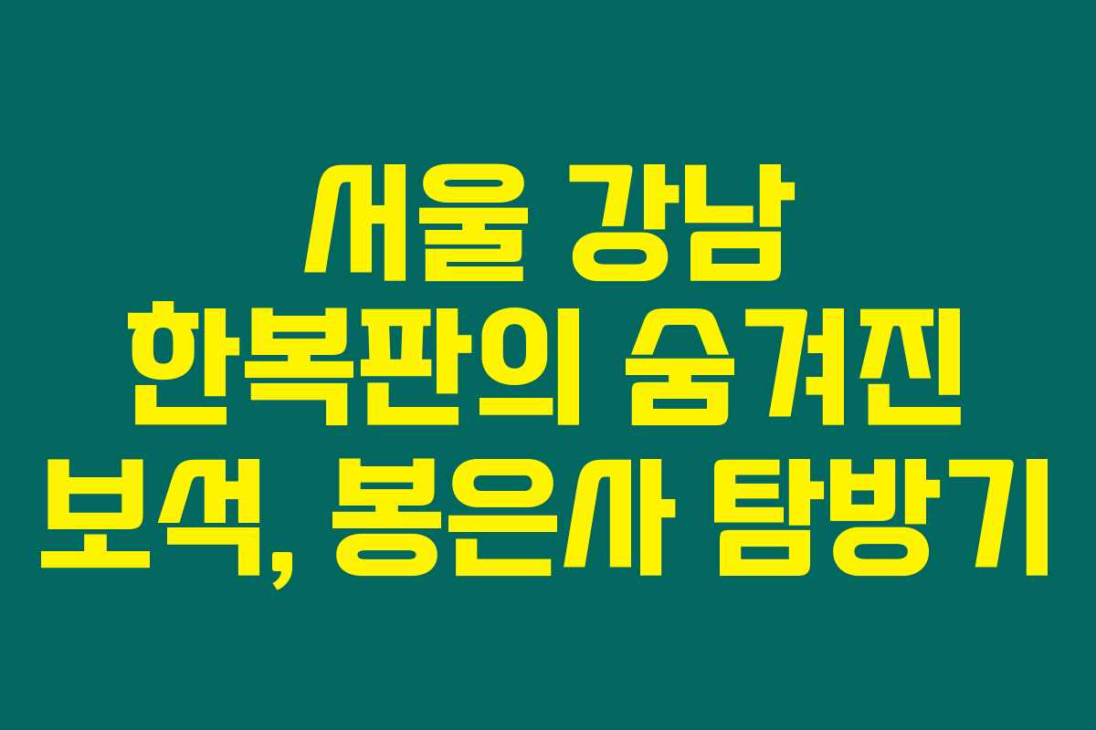 봉은사는 서울 강남 삼성동에 위치해 있으며, 고려시대에 세워진 오래된 사찰입니다. 출처에 따르면, 봉은사는 역사가 깊어 많은 불교 신자들이 찾는 장소일 뿐 아니라, 외국인들에게도 서울의 문화를 체험하는 공간으로 알려져 있습니다. 제가 여러 외국인 친구들을 안내해본 결과, 이곳은 평화로운 분위기와 아름다운 경관으로 많은 사랑을 받더라구요.