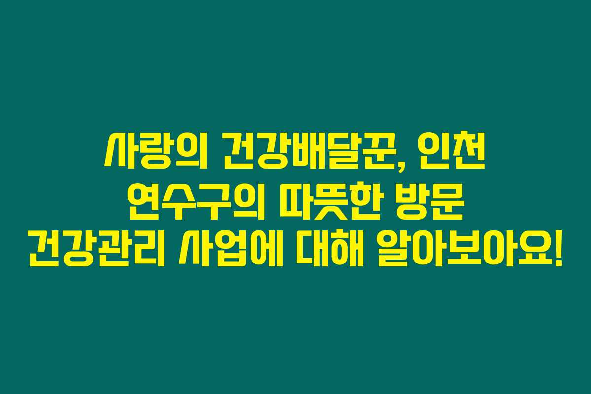 제가 직접 알아본 바로는, 인천 연수구에서 진행하는 방문 건강관리 사업은 지역사회의 소외된 어르신들에게 따뜻한 가슴을 전하고 있습니다. 이 사업은 계속해서 증가하는 고령화 사회에 발맞추어, 필요한 보건 의료 서비스를 직접 찾아가 제공함으로써, 더 많은 어르신들이 건강한 삶을 영위할 수 있도록 도와주고 있는 점이 인상적이었습니다. 아래를 읽어보시면 이 멋진 사업의 구체적인 내용을 알 수 있을 거예요.