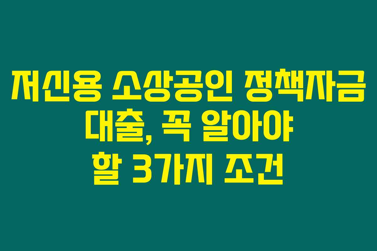 이제 저신용 소상공인 정책자금 대출의 세 가지 주요 조건을 수립해 보겠습니다. 제가 조사한 결과, 다음과 같은 조건들이 있습니다.