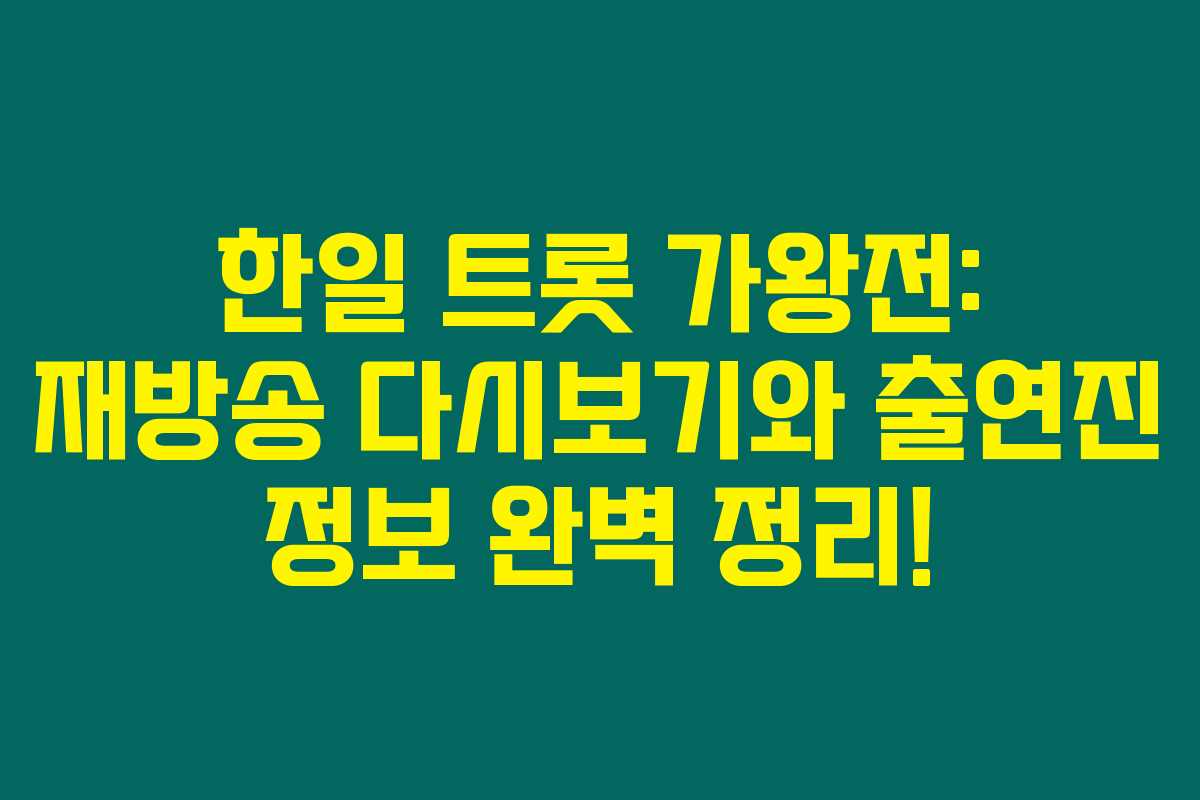 한일 트롯 가왕전을 기다리는 분들 많을겁니다. 한국과 일본의 트롯 가수가 한 자리에 모여 대결을 펼치는 이 프로그램, 재미있고 흥미로운 무대를 선사할 거예요. 한일 트롯 가왕전을 보고 싶다면 재방송과 공식 영상을 확인해야 하지 않겠어요? 아래를 읽어보시면 한일 트롯 가왕전의 모든 기본 정보를 비롯해 회차별 다시보기 방법까지 자세히 설명하니 꼭 확인해보세요!